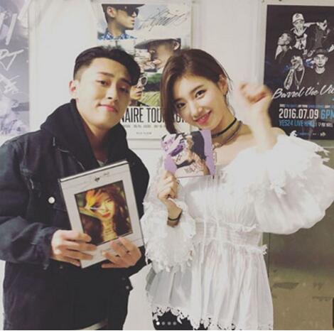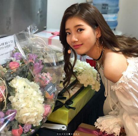 공개된 사진 속 수지는 팬들이 선물한 꽃다발 옆에서 화사한 미모를 뽐내는가 하면, 자신의 타이틀곡 ‘홀리데이(Holiday)‘를 피처링 한 래퍼 디피알 라이브(DPR LIVE)와 함께한 다정한 모습도 담겨있다.