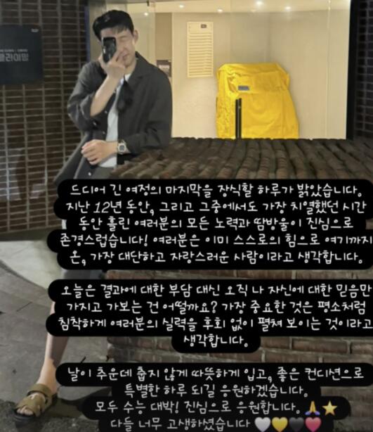 손흥민은 13일 자신의 SNS에 “드디어 긴 여정의 마지막을 장식할 하루가 밝았다”며 “지난 12년 동안, 그리고 그 중에서도 가장 치열했던 시간동안 흘린 여러분의 모든 노력과 땀방울이 진심으로 존경스럽다”고 말문을 열었다.