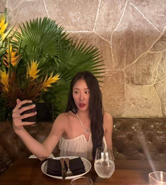 마지막 사진 속 그는 식당에서 화이트 슬리브리스 드레스를 착용한 채 우아한 분위기를 자아냈다. 은은한 조명과 식탁 세팅이 어우러져 한껏 무드 있는 저녁 시간을 즐기는 모습이 담겼다.