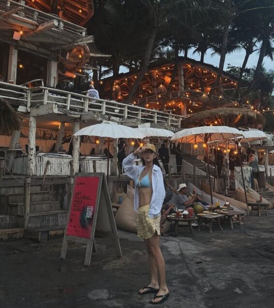 이어 공개된 여행지 사진에서는 해변가 바와 야외 라운지의 화려한 조명 아래 여름 분위기를 가득 담은 모습이 담겼다. 캐주얼한 모자와 셔츠, 비키니 톱 조합으로 편안하면서도 스타일리시한 휴양지 패션을 완성했다.