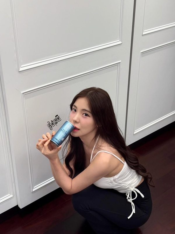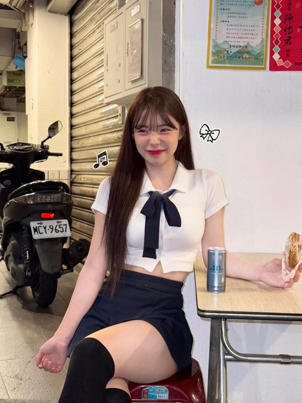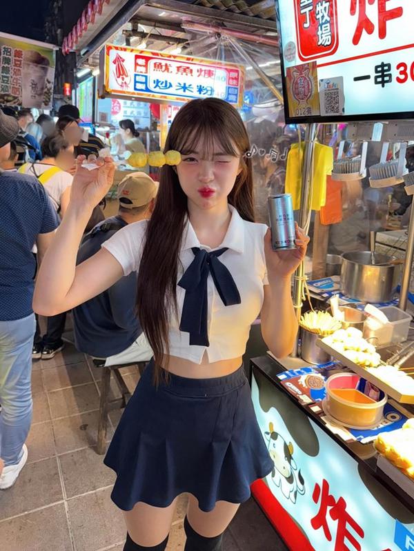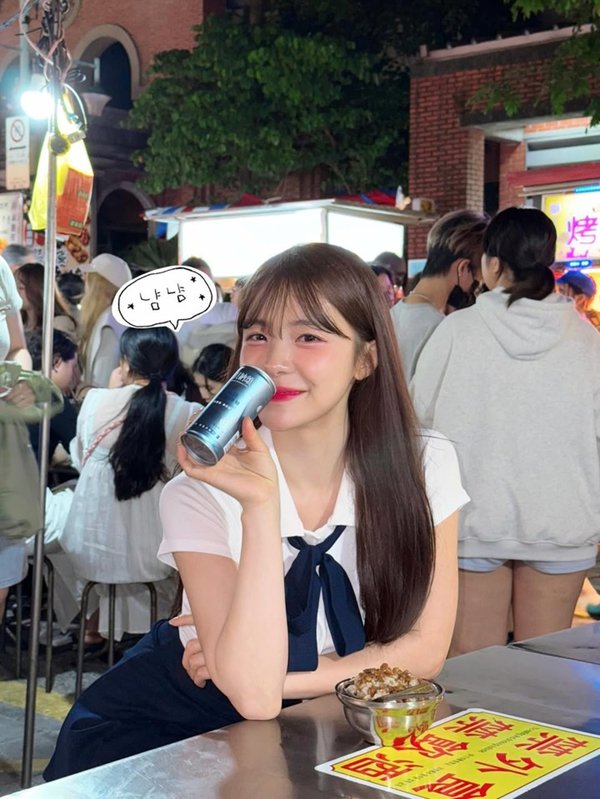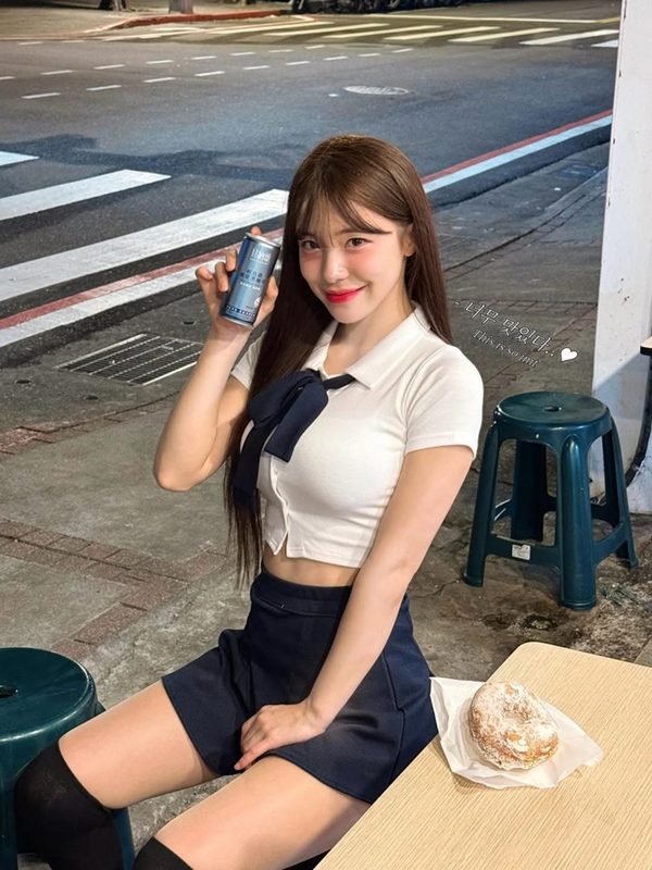 공개된 사진에서 그는 야시장, 거리 음식점 등 다양한 장소를 배경으로 캔 음료를 들고 있는 모습이다. 흰색 크롭 블라우스에 네이비색 리본과 플레어 스커트를 매치해 발랄한 분위기를 자아냈으며, 무릎 위까지 올라오는 롱 삭스를 더해 러블리한 스타일을 완성했다.