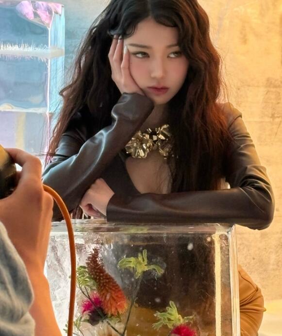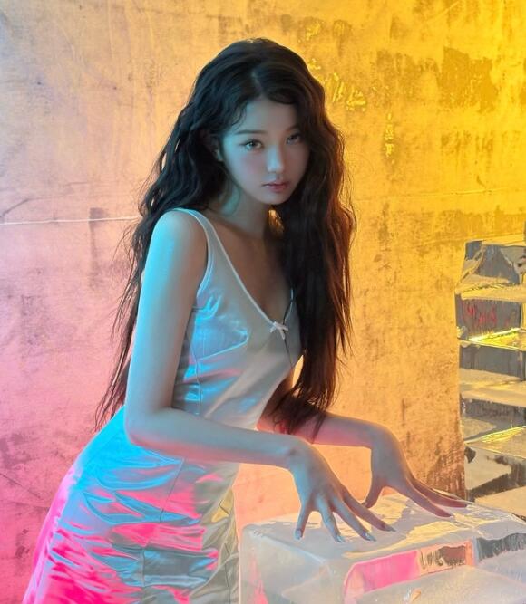 먼저 은은한 광택이 도는 실버 슬립 드레스를 착용한 장원영은 젖은 듯 연출한 웨이브 헤어스타일로 몽환적이면서도 신비로운 아우라를 발산했다. 투명한 얼음 오브제와 어우러진 그의 모습은 마치 판타지 영화 속 한 장면을 연상케 했다.